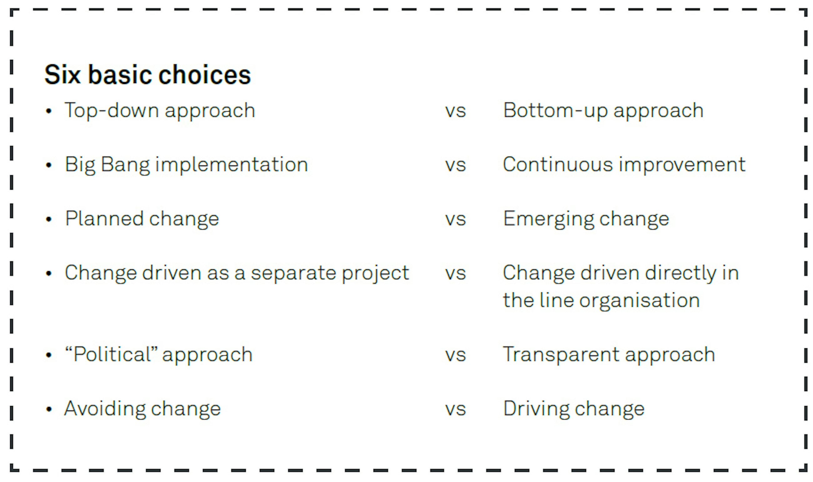 On the other hand, many of the change challenges described during the interviews were not possible to predict or handle with a continuous improvement approach. Usually, these are change initiatives coming from the top of the organisation, driven by challenges in the surrounding world or by major internal strategic shifts (turnarounds, transformations etc.) and often with a clear beginning and end date.