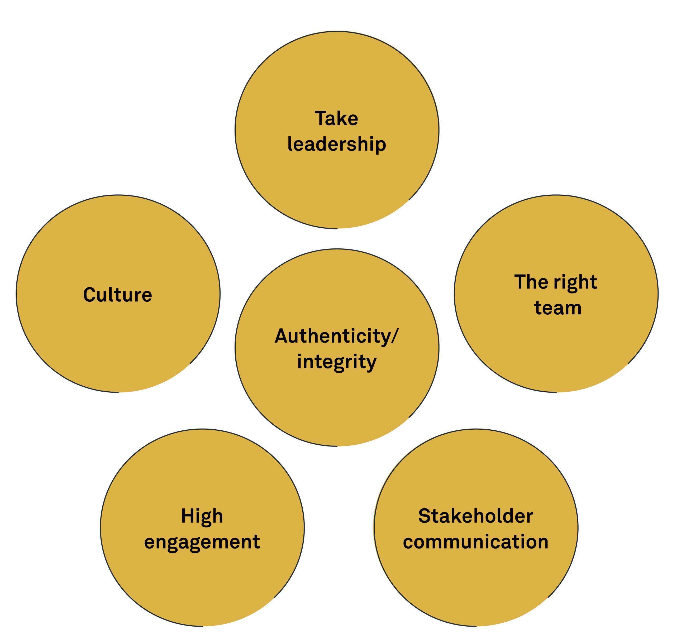 The importance of communication throughout the change process to get everybody “on board” has been a recurring theme in all the conversations, but also the difficulty in succeeding with the communication. Several CEOs talked about transparency as a key quality of their change communication – for them, transparency means: